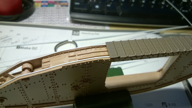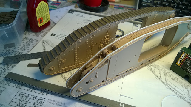 Takom suggests that one could drop the small parts and glue the plates directly to the sponsons, but then the small gap between the tracks and the sponsons on the original would disappear, so I glued small 0,36mm styrene strips on the sponsons and glued the tracks onto these
